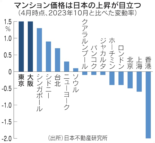「国際不動産価格賃料指数」の4月調査によると、東京と大阪のマンション価格の前回調査(2023年10月)に対する上昇率がそれぞれ1.5%となり、世界主要15都市の中で首位となった。そろって首位となるのは10年の調査開始以来で初となります。国際的な割安感と円安の影響を受けて海外マネーが流入。株価が歴史的な高値圏にある日本の富裕層の購入が進んだりしました。